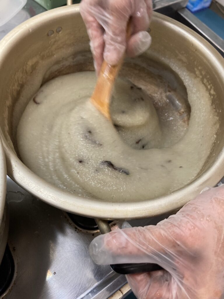 数年前に教わったこんにゃく作りのやり方をみんなで実践しようと、スタッフが準備して好きなものを混ぜてみたりしてつくる会。